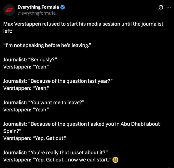 During a media session at the Red Bull hospitality suite, Verstappen singled out Guardian reporter Giles Richards, saying he would not begin until Richards left. Richards asked if it was because of a question he asked after the 2025 Abu Dhabi race. Verstappen said yes. When Richards asked if he was really still that upset about it, Verstappen's response was simple: “Get out. Yeah. Get out.” Richards' colleagues were, by his own account, universally shocked at the altercation.