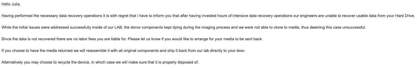 But then, there was silence. A silence you grow worried about when your entire career is on that drive. I got no updates, no progress logs… not even an imaging report. After a brief clarifying email where I learned that my drive self-encrypts, my next contact with the recovery team was the news I dreaded: my data could not be recovered.