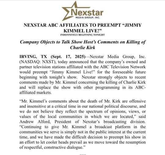 Within hours it was a domino effect. Federal Communications Commission chairman Brendan Carr praised Nexstar for “doing the right thing”. The country's second-largest broadcast company (Sinclair, Inc) also pulled the show from its ABC stations. By that evening, ABC made it network-wide: the show would be preempted indefinitely.
